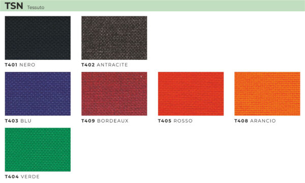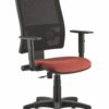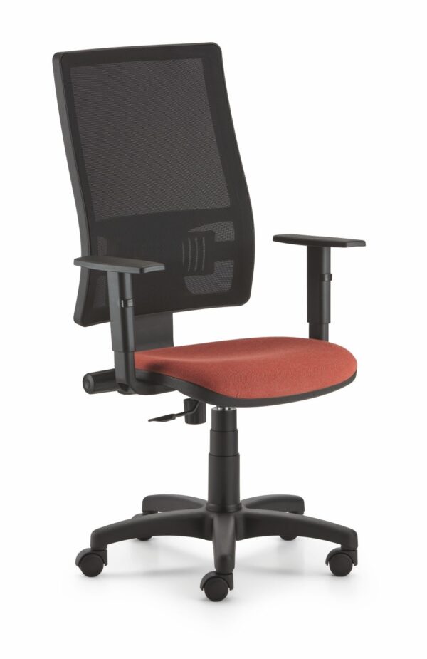 Plastiche nere e rete colorata, supporto lombare regolabile; braccioli regolabili, movimento contatto permanente, alzata a gas; sedile imbottito e rivestito.